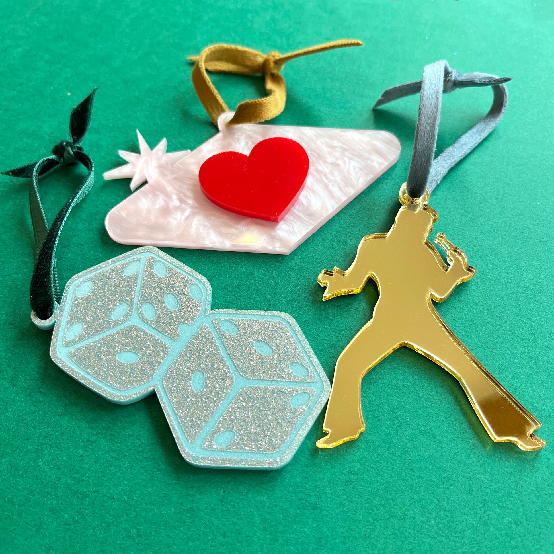 These Christmas ornaments are made of a variety of mirror, pearl, and glitter finish plexiglass. Each ornament is hand made with love by me :)